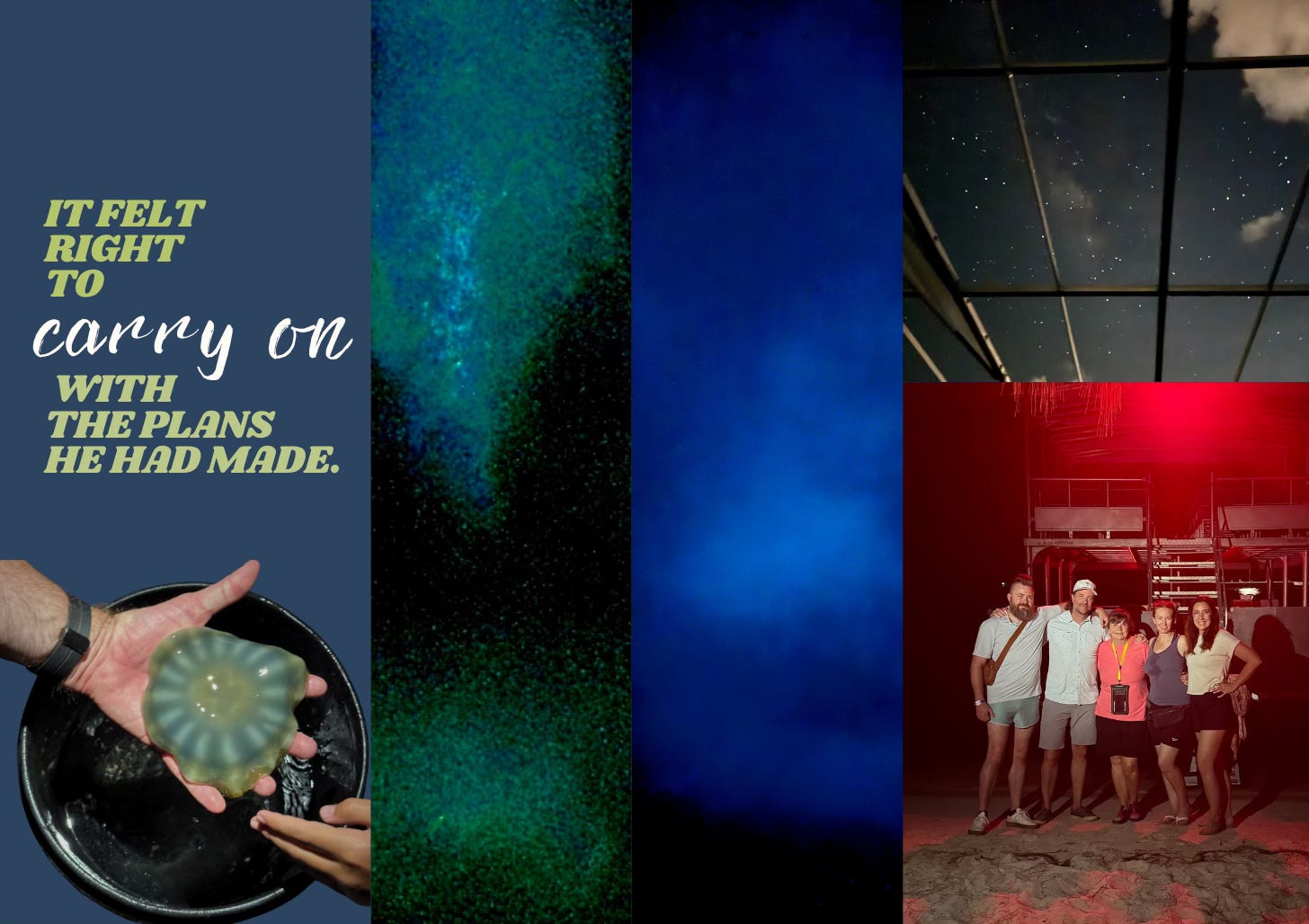 Our final evening in Grand Cayman, we all boarded a boat for the bioluminescence excursion my dad had booked. It was heavenly. For days, the shock of losing him had kept my body tight, but the night breeze and rocking waves began to loosen the grief in my rib cage.