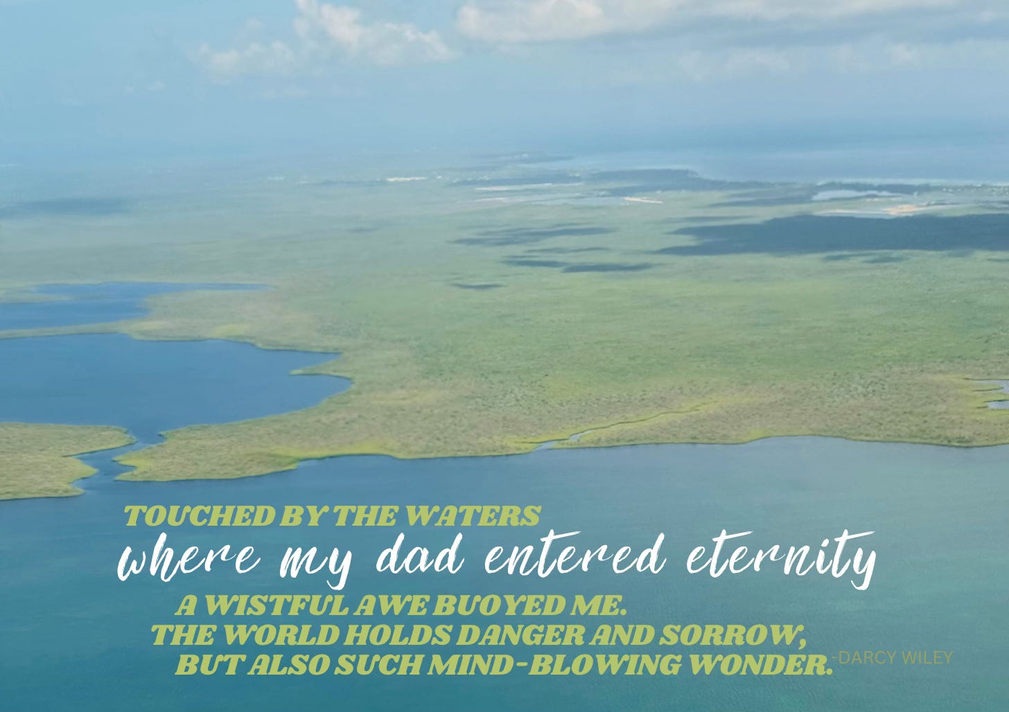 Jellyfish tentacles swayed like sea plants in the shallows. We tilted our heads back and named the constellations framed by puffy clouds. Murmurations of blue fire pixie dust lit up as we kicked our legs and made figure-eights with our fingers like sparklers in the bay. Touched by the waters where my dad entered eternity, a wistful awe buoyed me. The world holds danger and sorrow, but also such mind-blowing wonder.