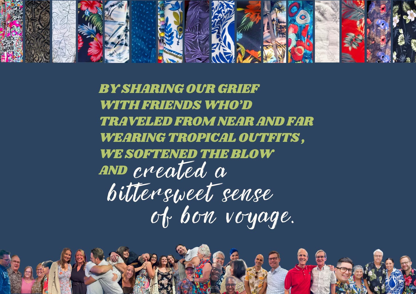 And by sharing our grief with friends who’d traveled from near and far in tropical outfits, we softened the blow and created a bittersweet sense of bon voyage.